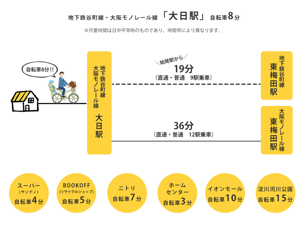 - 交通:地下鉄谷町線/大阪モノレール線「大日」駅 自転車 8 分